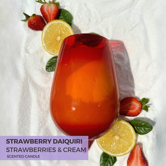 But wait, there's more! As the candle continues to warm your space, it uncovers a heart brimming with the sweetness of strawberries and the luxurious essence of cream. Envision this, sweethearts: You're lounging by the beach, indulging in a fresh strawberry dessert, the creaminess perfectly balancing the sweetness. It's heavenly, isn't it? That's the middle note of our Strawberry Daiquiri candle for you.